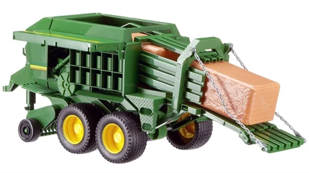 bruder 02017 – Bruder 02017 John Deere big balepress(BF2017). The Bruder 2017 John Deere 690 baler is a toy baler based on the real John Deere 690 large baler. This Bruder 2017 toy version has several movable parts, so that it is not a static toy, but with which the young farmer can fully immerse himself in the real thing. The pick-up of the Bruder 2017 John Deere 690 baler rotates while driving and the toy baler itself also has moving parts. The side cover of the Bruder 2017 can also be opened to view the interior. The driving motion drives the hay bales backwards, which gives an even more realistic image. The double axles are equipped with real rubber wheels with profile. Because the Bruder toy models are all in the same size, you can combine endlessly. The Bruder 2017 John Deere 690 large baler has a standard coupling so it fits behind all Bruder tractors. The set is supplied including bales.