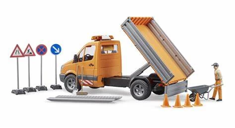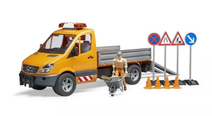 The BRUDER construction worker including wheelbarrow, tools, signs, and traffic cones has also been included so you can immediately start playing. The Sprinter features a light and sound
