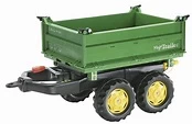 This green trailer features the ability to tip in three directions and to have all sides drop down when needed. It also includes a crank on the front of the unit to help with lifting and tipping stored contents. Rolly Mega Trailer, Green: High-impact blow-moulded resin body. Durable metal chassis Double axle wheel All sides drop down